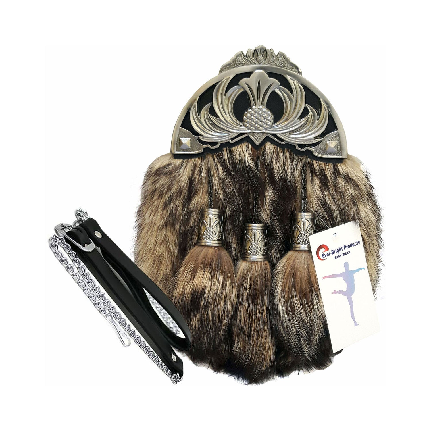 High-Quality Full Dress Sporran: Elevate your style with the Original Fox Fur Full Dress Sporran, featuring an antique anemal CROWN cantel.Ten Years Rust-Free Warranty: Enjoy peace of mind with a decade-long warranty for lasting durability.Handmade Excellence: Expertly crafted with original fox fur and 100% genuine soft leather for long-lasting use.Distinctive CROWN Design: Embossed CROWN design on tassel caps adds an elegant touch to this exceptional sporran.Comprehensive Package: Your purchase includes a real leather belt and a rust-free, plated chain, accommodating various sizes.