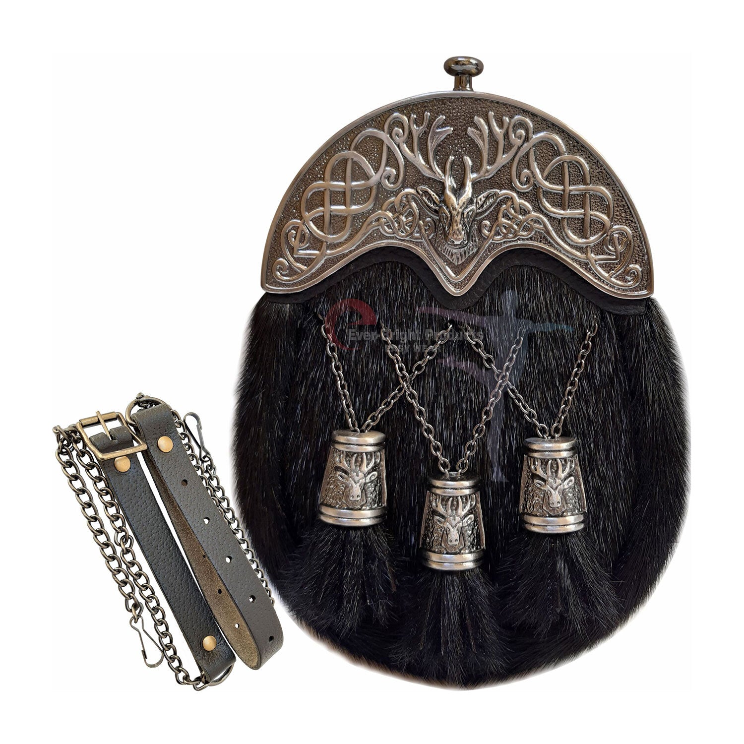 100% Real LeatherImportedSnap closureSave From WaterAdjustable Chain Belt upto 30 to 48 inches. Life Time Rust Free Warranty.100% Real Soft Leather for Long Time Use. Sporran Width is "8" Inches & Hight is "9.5" Inches Approximately .This is Very Very High Quality Beautiful Adult Full Dress Sporran Celtic Design. Never Seen Before & Rust free item.100% Real Genuine Leather. Three Original Black Seal Skin Tassels & Embossed Stag On Tassel Caps. Completely Hand made With High Quality leather and Material. Low Prices Guaranteed.Adjustable Chain Belt upto 30 to 48 inches. Free Real & Soft Leather Belt & Chain Included In Your Purchase To Fit Wide Range Of Sizes. Nickle and Chromed Plated Tassel Chains & Caps.Please Don't Compare This Sporran With Low Quality Sporran Selling On Ebay or other Online Shops .