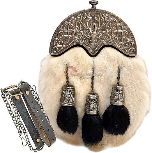 100% Real LeatherImportedSnap closureSave From WaterAdjustable Chain Belt upto 30 to 48 inches. Life Time Rust Free Warranty.100% Real Soft Leather for Long Time Use. Sporran Width is "8" Inches & Hight is "9.5" Inches Approximately .This is Very Very High Quality Beautiful Adult Full Dress Sporran Celtic Design. Never Seen Before & Rust free item.100% Real Genuine Leather. Three Original Black Skin Tassels & Embossed Stag On Tassel Caps .Completely Hand made With High Quality leather and Material. Low Prices Guaranteed.Adjustable Chain Belt upto 30 to 48 inches. Free Real & Soft Leather Belt & Chain Included In Your Purchase To Fit Wide Range Of Sizes. Nickle and Chromed Plated Tassel Chains & Caps.Please Don't Compare This Sporran With Low Quality Sporran Selling On Ebay or other Online Shops .