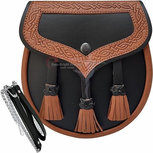 Genuine 100% real leather Semi Dress Sporran in Black & BrownUnique Black & Brown leather knot tassels for added styleAdjustable leather chain belt, fitting waist sizes from 30 to 52 inchesExpertly crafted for quality and uniquenessElevate your kilt attire with this distinctive and high-quality sporran.