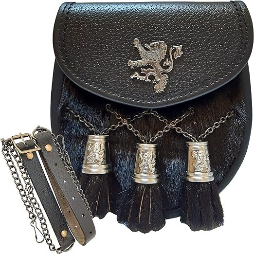 Semi Full Dress Black seal skin Sporran with a Celtic Lion Brass Chrome BadgeCrafted from 100% genuine leather for quality and styleAdjustable chain belt fits waist sizes from 30 to 48 inchesFeatures three black skin tassels and embossed Brass Lion enamel on tassel capsLifetime rust-free warranty for lasting qualityNickle and chromed plated tassel chains and capsA unique and sophisticated addition to your Scottish kilt ensemble, distinct from lower-quality online options.