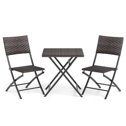 3 Piece Rattan Bistro Set Outdoor Folding Dining Table and Chairs with Wicker Seat