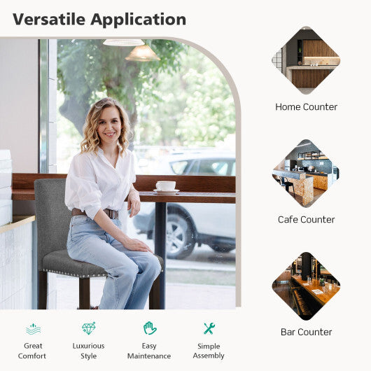 The backrest and seat are filled with sponge and covered with PVC leather(Black color) or linen fabric(Gray color). Both materials are fairly soft and breathable enabling guests to enjoy great comfort. Also each bar stool's stability is perfectly ensured. Protective non-slip pads gain good balance and avoid floor scratches. The overall weight capacity is up to 245 lbs. Meanwhile designed with 25.5" high seat and 7" high footrest our bar stools with rivet provide spacious space for feet stretching. For various needs each 19" x 20" x 39" bar stool is ideal for kitchen dining room bar cafe party room and more.