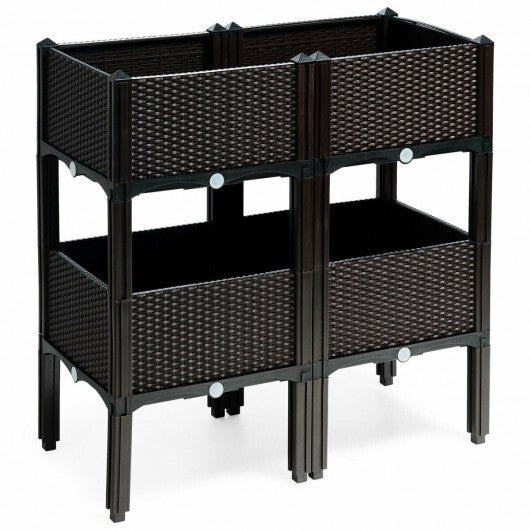 Constructed of high-density polyethylene (HDPE) the planter box is solid and weather-resistant to withstand the change of weather. There are 4 planting boxes for you to setup in different shape. The height of garden bed is about 17 inches (include brackets) which can protect your plants from garden animal and pests. With our planter you don't have to bend over or kneel for long time to grow plants and reduce pain on your back and knee. Elevated garden bed is designed with self-watering disk and drain holes to provide extra space for reserving water and help plants to absorb entirely. It can prevent plant from rot or over-drying effectively.Not only can these garden beds with rattan style help you grow plants but they also are nice decorations in your outdoor space.