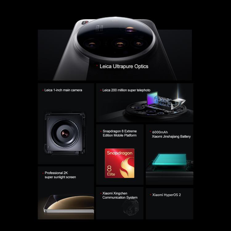 Specification: 1. Processor: Snapdragon 8 Elite 3nm octa-core, up to 4.32GHz 2. GPU: Adreno 3. Memory Capacity: 12GB+256GB / LPDDR5X+UFS 4.1 4. Operating System: Xiaomi HyperOS 2 5. Fingerprint unlocking: 3D ultrasonic fingerprint 6. Sensors: Distance sensor, Under-screen ambient light (color temperature) sensor, Rear ambient light (color temperature) sensor, Accelerometer, Gyroscope, Electronic compass, X-axis linear motor, Infrared remote control, Flicker sensor, Laser focus sensor, Barometer 7. Charging port: Type-C 8. SIM card slot: Dual Nano-SIM card slot 9. Languages: English, Simple Chinese, Traditional Chinese (more languages can be refreshed and updated) 10. Dimensions: 161.3 x 75.3 x 9.35-9.48mm 11. Weight: 226-229g Screen Display: 1. Screen: 6.73 AMOLED 2. Pixels: 3200 x 1440 3. Refresh Rate: 120Hz 4. Sampling Rate: 300Hz Battery: 1. Battery capacity: 6000mAh 2. Charging power: 90W wired / 80W wireless charging 3. Fast charging: Support QC3+ / QC3.0 / QC2.0 / PD3.0 / PD2.0 protocol Cameras: 1. Rear Camera: 50MP + 200MP + 50MP + 50MP 2. Front camera: 32MP Network Band: 1. 5G: N1/2/3/5/7/8/12/20/26/28/38/40/41/48/66/77/78/79/80/81/83/84/89 2. 4G: FDD-LTE: B1/2/3/4/5/7/8/12/17/18/19/20/26/28/66; TDD-LTE: B34/38/39/40/41/42/48 3. 3G: WCDMA: B1/2/4/5/6/8/19 4. 2G: GSM: B2/B3/B5/B8 (Note: The actual network and frequency band usage depends on the deployment of local operators) Wireless Network: 1. WiFi: Supports Wi-Fi 7, Wi-Fi 6 Enhanced Edition, W-iFi 5, Wi-Fi 4 and 802.11a/b/g; 2.4GHz /5GHz 2. Bluetooth: V6.0, Dual-Bluetooth 3. Navigation: Beidou, GPS, Galileo, GLONASS, QZSS, NavIC, AGNSS 4. Support multi-function NFC Package List: 1. Mobile Phone x 1 2. Eject Pin x 1 3. Protective Case x 1 4. USB Cable x 1 5. US Plug Charging Power Adapter x 1 6. Pre-attached Protective Film x 1 (The actual product shall prevail)