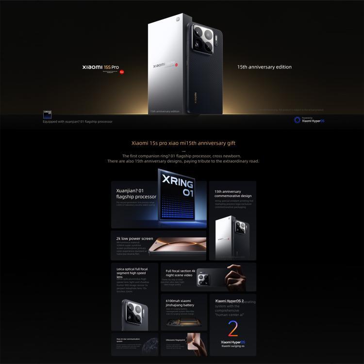 Specification: 1. Processor: Xring O1 3nm deca-core, up to 3.9GHz 2. GPU: Immortalis-G925 16 core 3. Memory Capacity: 16GB LPDDR5T+ 512GB UFS 4.1 4. Operating System: Xiaomi HyperOS 2 5. Fingerprint unlocking: 3D ultrasonic fingerprint 6. Sensors: Distance sensor, Under-screen ambient light (color temperature) sensor, Rear ambient light (color temperature) sensor, Accelerometer, Gyroscope, Electronic compass, X-axis linear motor, Infrared remote control, Flicker sensor, Laser focus sensor, Barometer 7. Charging port: Type-C 8. SIM card slot: Dual Nano-SIM card slot 9. Languages: English, Simple Chinese, Traditional Chinese (more languages can be refreshed and updated) 10. Dimensions: 161.3 x 75.3 x 8.33mm 11. Weight: 216g Screen Display: 1. Screen: 6.73 AMOLED 2. Pixels: 3200 x 1440 3. Refresh Rate: 120Hz 4. Sampling Rate: 300Hz Battery: 1. Battery capacity: 6100mAh 2. Charging power: 90W wired / 50W wireless charging Cameras: 1. Rear Camera: 50MP Hunter 900 High Dynamic Range Main + 50MP 120mm Leica periscope telephoto + 50MP 115 degree Leica ultra-wide angle 2. Front camera: 32MP Network Band: 1. 5G: N1/2/3/5/7/8/12/20/26/28/38/40/41/48/66/77/78/79 2. 4G: FDD-LTE: B1/2/3/4/5/7/8/12/17/18/19/20/26/28/66; TDD-LTE: B34/38/39/40/41/42/48 3. 3G: WCDMA: B1/2/4/5/6/8/19 4. 2G: GSM: B2/B3/B5/B8 (Note: The actual network and frequency band usage depends on the deployment of local operators) Wireless Network: 1. WiFi: Supports Wi-Fi 7, Wi-Fi 6, W-iFi 5, Wi-Fi 4 and 802.11a/b/g; 2.4GHz /5GHz 2. BT: V5.4 3. Navigation: BeiDou, GPS, Galileo, GLONASS, QZSS, AGNSS 4. Support multi-function NFC Package List: 1. Mobile Phone x 1 2. Eject Pin x 1 3. Protective Case x 1 4. USB Cable x 1 5. US Plug Power Adapter x 1 6. Pre-attached Protective Film x 1 (The actual product shall prevail)