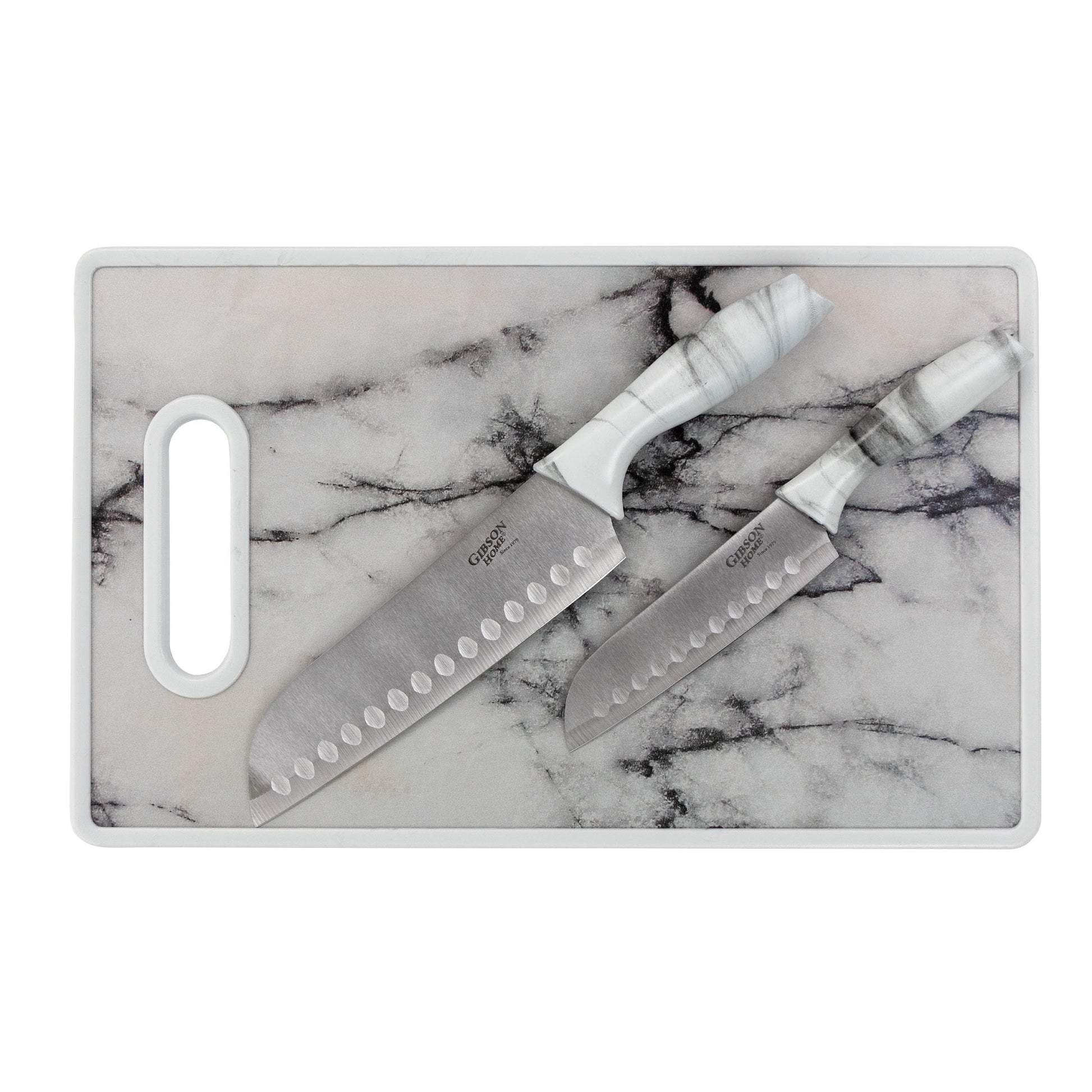 Gibson Home Beaumont 3 Piece Stainless Steel Santoku Knife Set with Cutting Board in White Marble