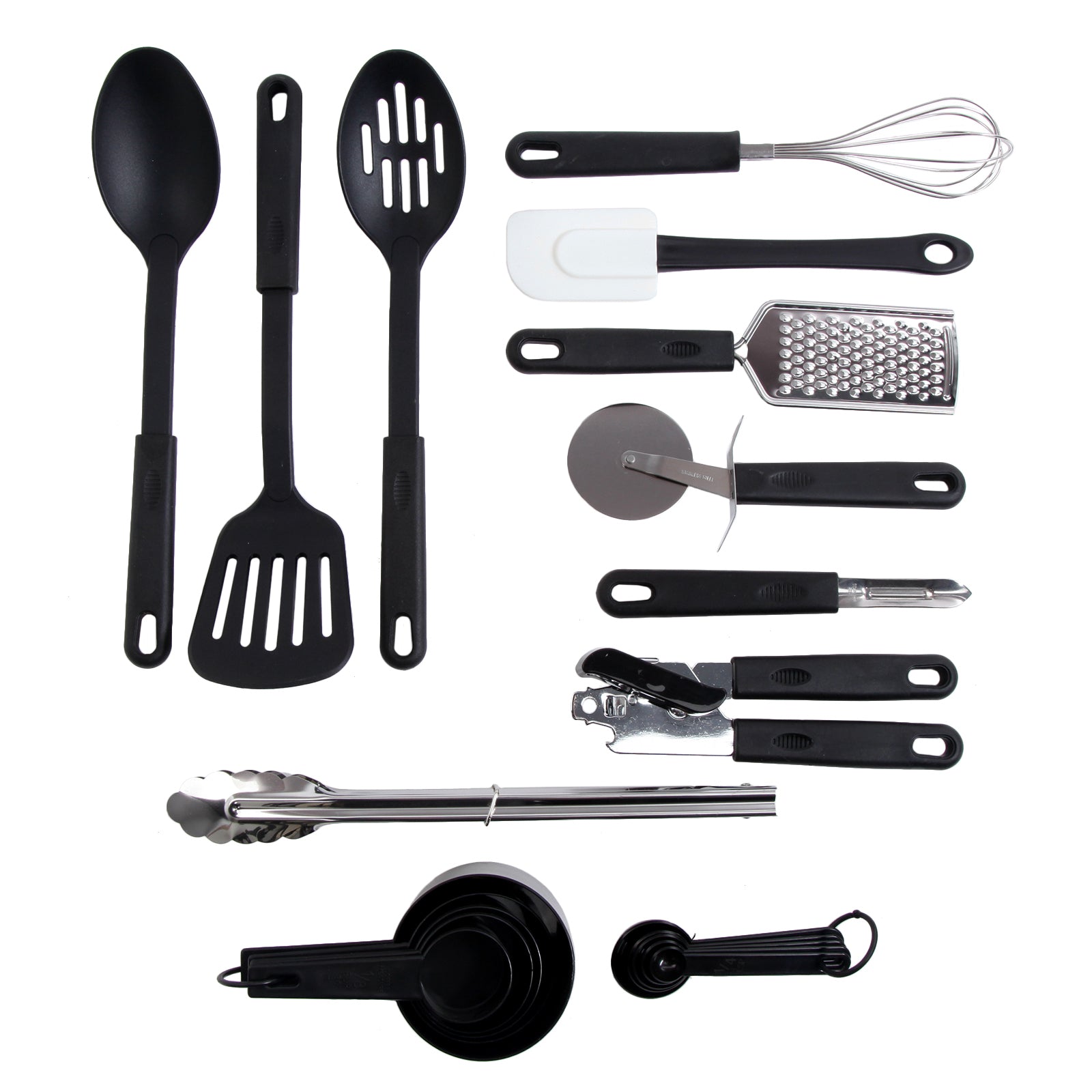 Includes: one peeler, one pizza cutter, one slotted spoon, one serving spoon, one whisker, grater, one slotted turner, one can opener, one food tong, one spatula, five measuring cups and five measuring spoons