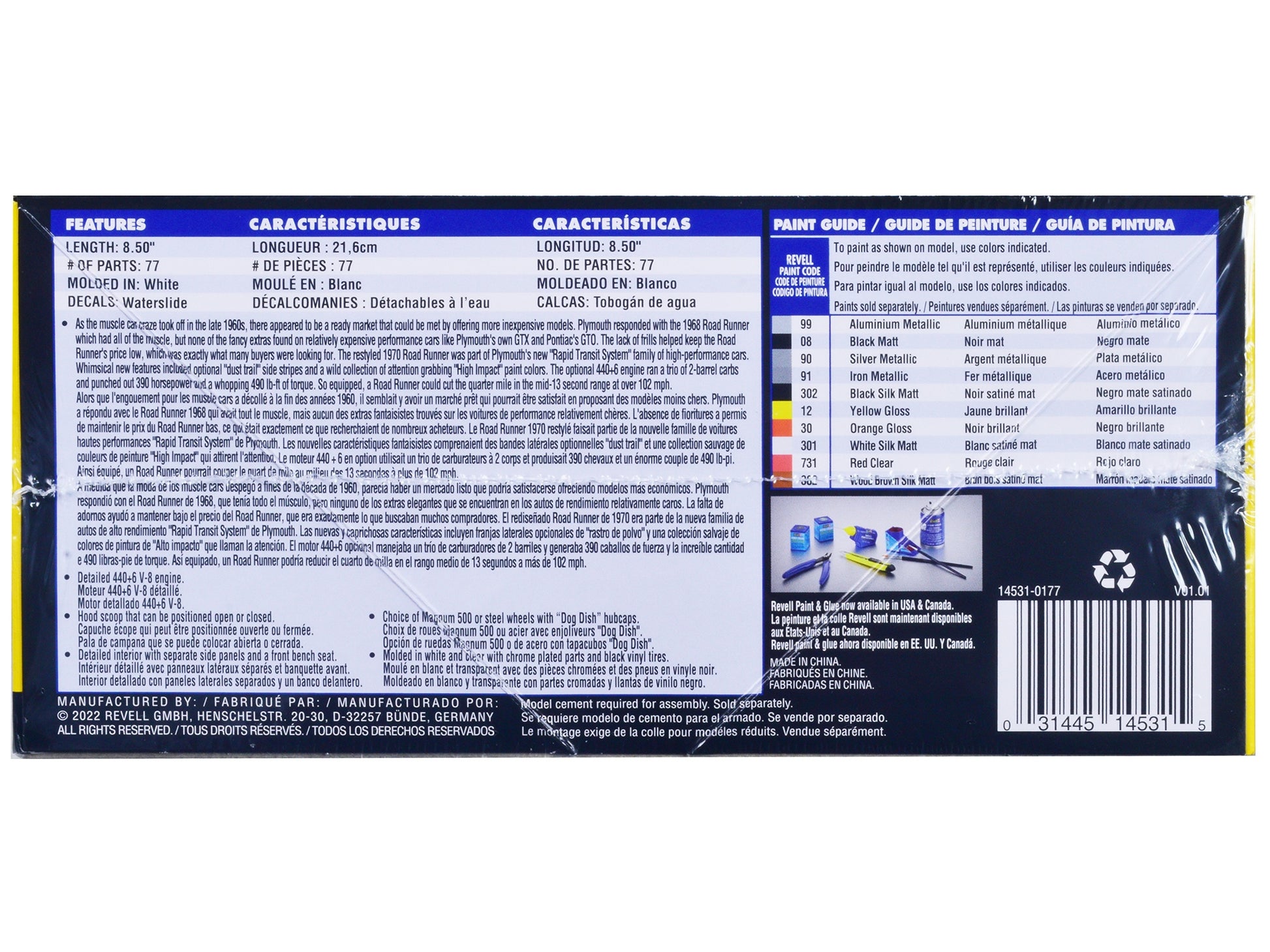 - Brand new plastic model kit of 1970 Plymouth Road Runner (Level 4) 1/24 plastic model kit by Revell.
