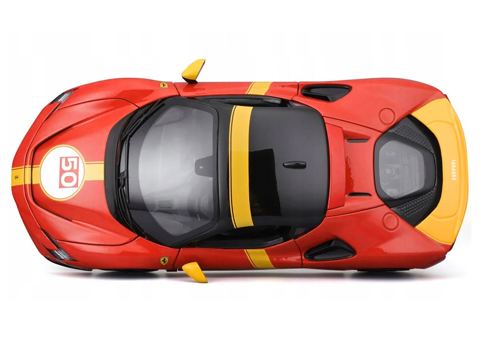 - Brand new 1/18 scale diecast car model of Ferrari SF90 Stradale Assetto Fiorano #50 Red with Black Top and Yellow Stripes "Race + Play" Series die cast model car by Bburago.