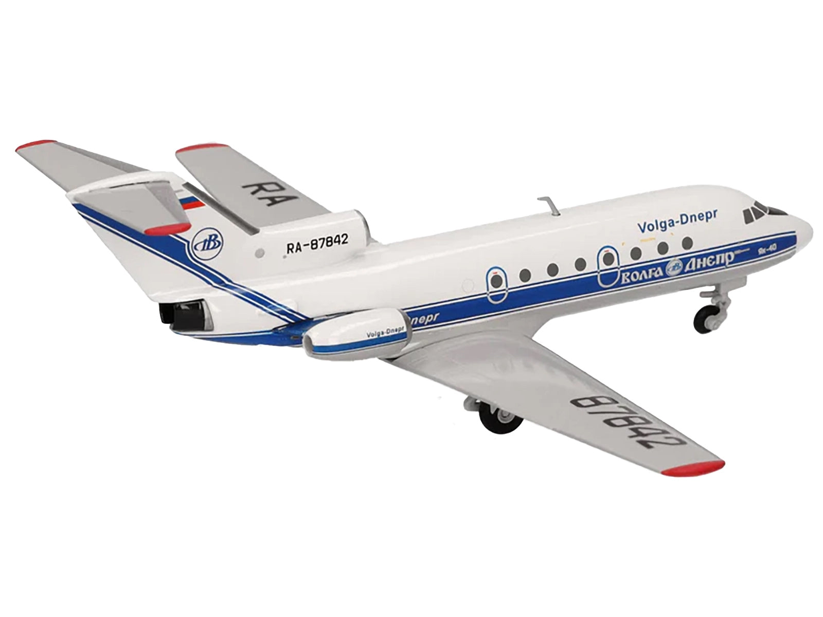 - Brand new 1/200 scale diecast airplane model of Yakovlev Yak-40 Commercial Aircraft "Volga-Dnepr Airlines" (RA-87842) White with Blue Stripes die cast model by Herpa.