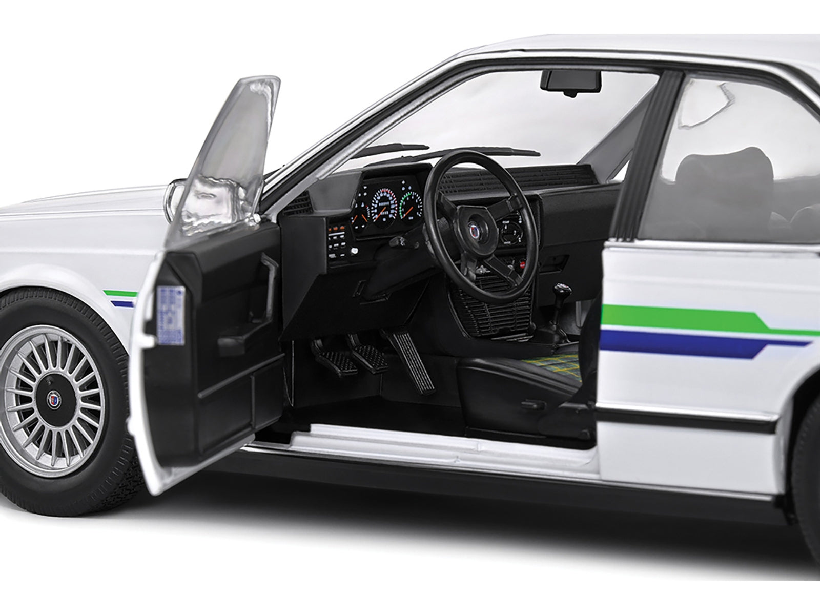 - Brand new 1/18 scale diecast car model of 1984 BMW Alpina B7 Turbo (E24) White with Blue and Green Graphics die cast model car by Solido.