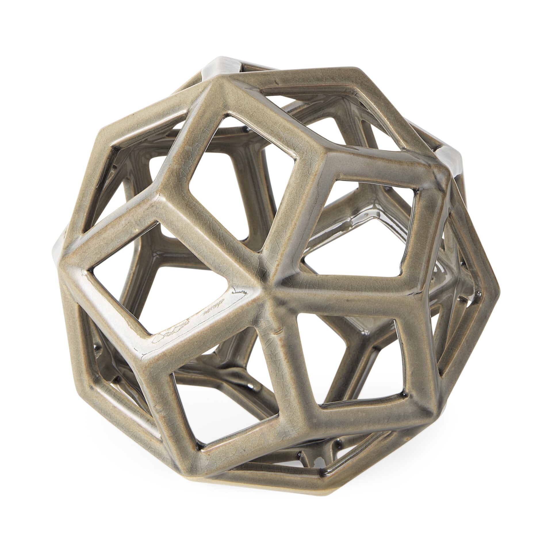 The Khaki Crackle Glaze Ceramic Geometric Sculpture will be the pefect addition to the decor in your home. This stunning geometric orb is full of clean lines and soft curves along with a gorgeous tan/khaki reactive glaze that crackles when fired and gives an incredibly unique and fun look. The design is see-through which gives it an airy appearance that is not only great but makes this decor piece light enought to be moved around. The neutral coloway and the minimal design allow you to use this decor piece with interior style or colors you already have in your home. 7" H x 7" W x 7" D