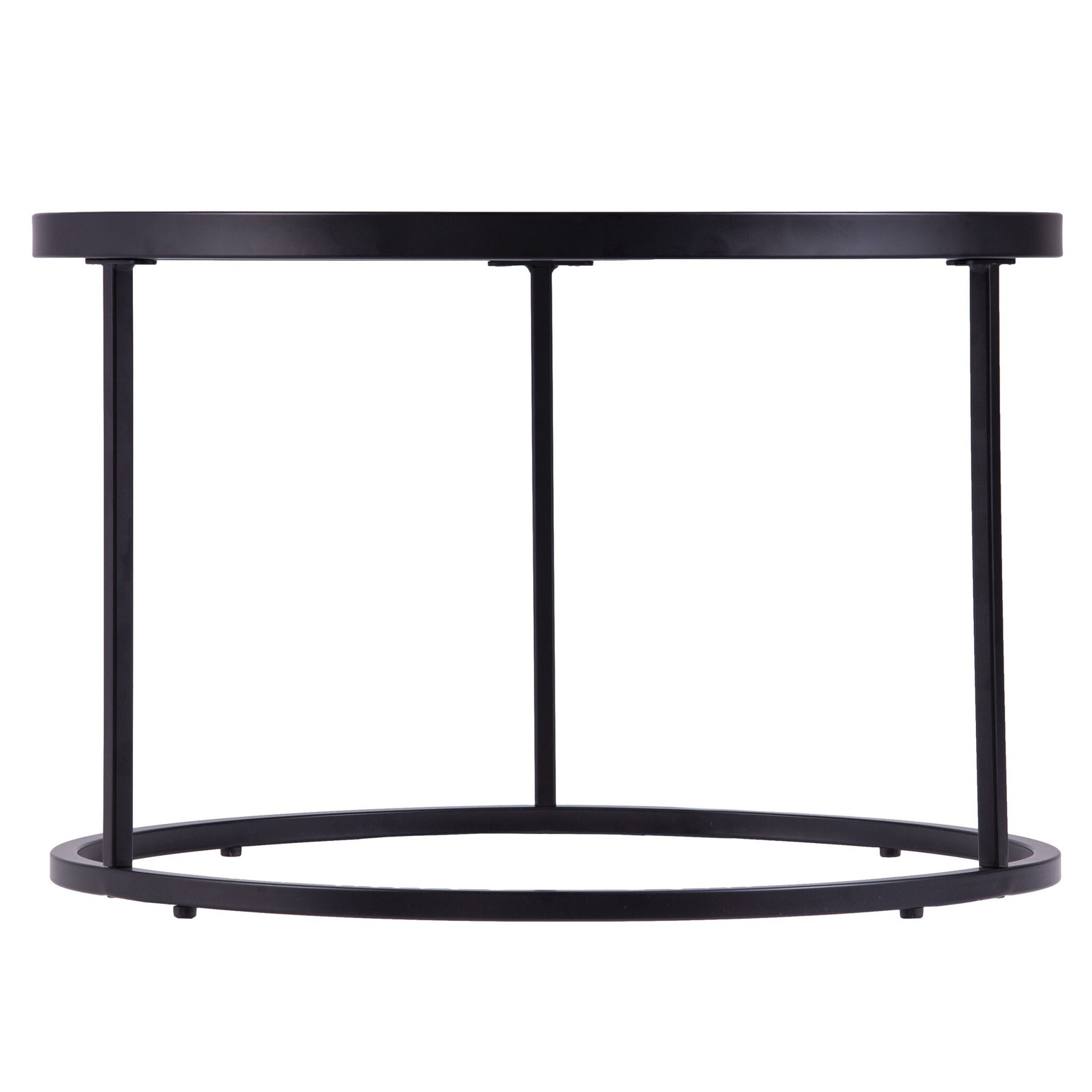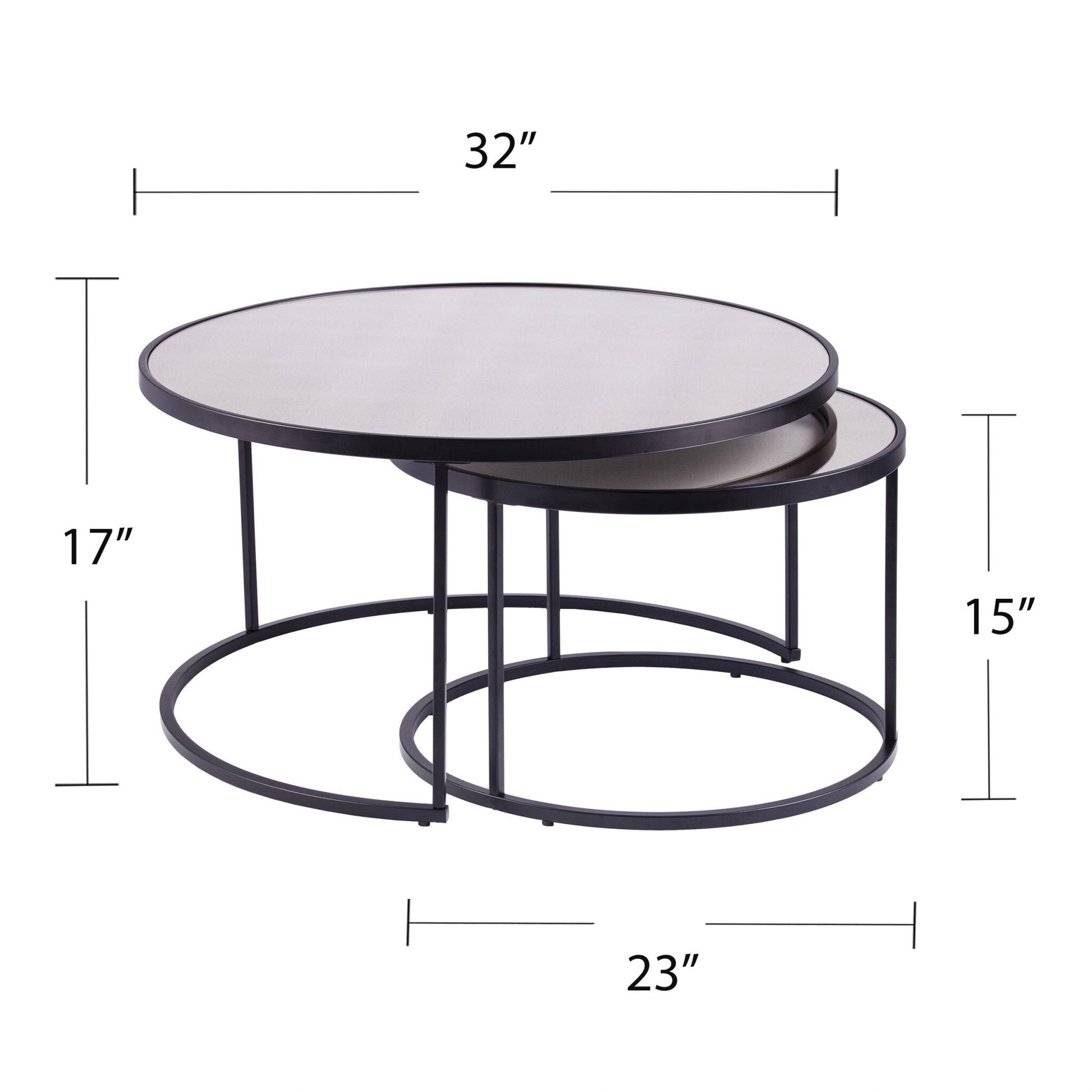 Give your living room, family room, or office the perfect anchor piece with this set of two black and silver mirrored round nested coffee table set. This multi-functional coffee table is built to last from high quality metal and glass. Quality construction from the black metal base combines with silver mirrored of the top to give this table a fresh and updated look. Reflective pieces of mirrored glass give this table a glamorous and unique look. This round table features a unique shape to give your room a visually pleasing accent. The top of this table is silver, while the base is a nice compliment in black. A great set that can be used together or separated as you desire. Nests when not in use. 17" H x 32" W x 32" D