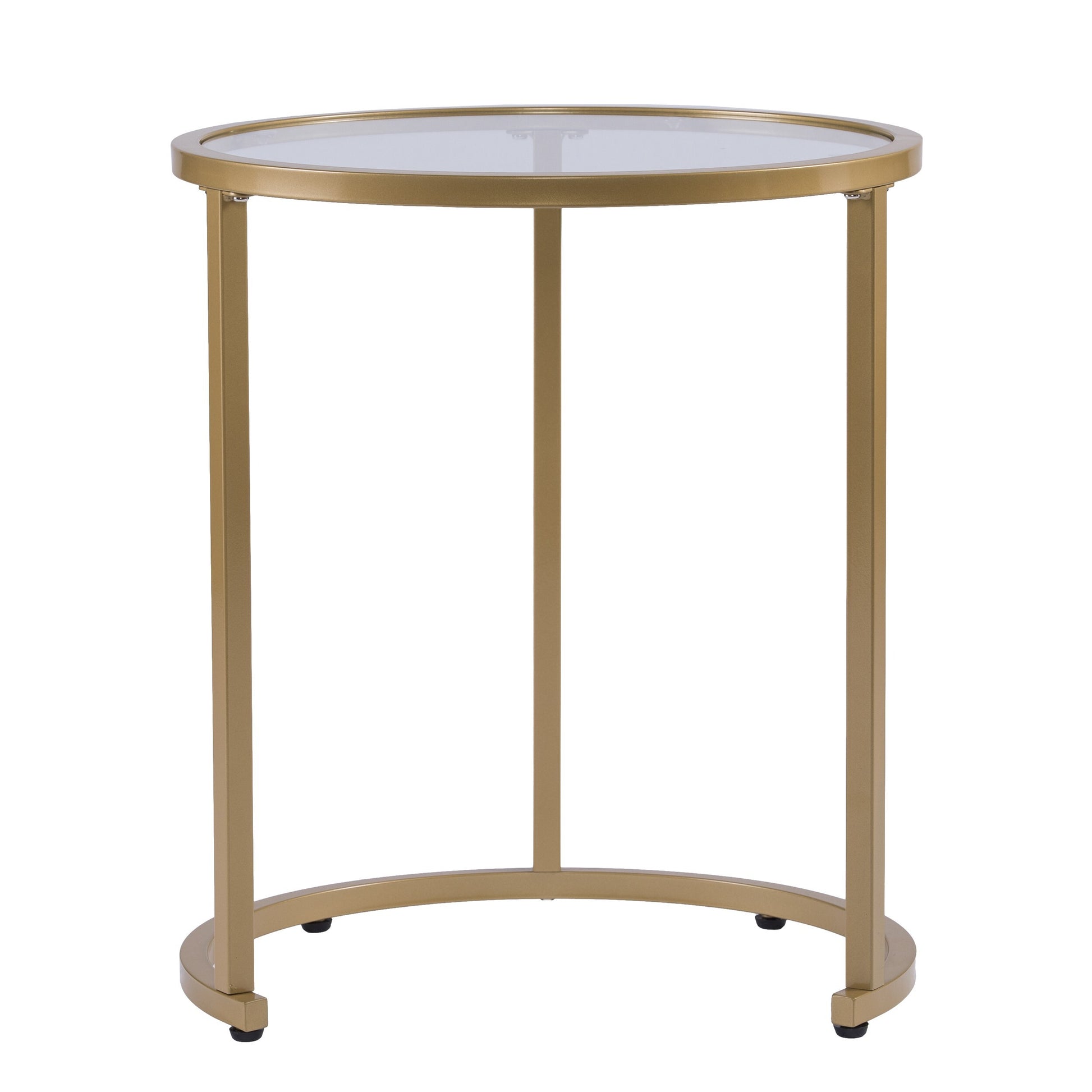 Show off your exquisite taste with this set of two 23" gold glass and steel round nested tables. The nesting feature is a great space saver for when not in use. Crafted from metal, this sturdy and versatile little table has a charming style. A sleek gold monotone color gives this steel and glass table a fresh and updated look. A great accent on either side of the sofa or bed, this adorable end or side table is just what you need. You can also use it as an entryway table to hold your keys. 23" H x 19.5" W x 19.5" D