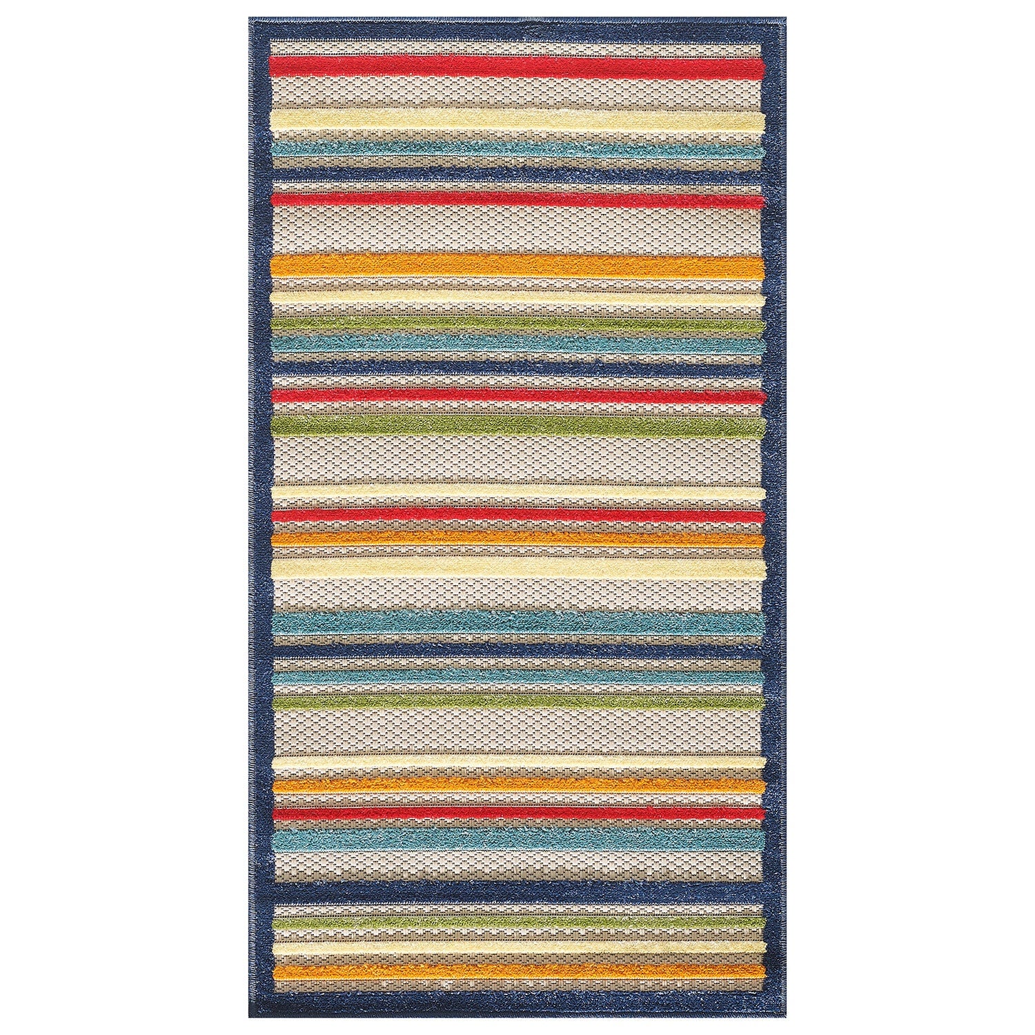 Add some artistry to your room with this 7' x 9' ivory and blue striped stain resistant indoor outdoor area rug. This rectangle shaped rug features a striped design in ivory and blue to give it visual interest. A classic shape marries with good looking design for your space Made in Turkey, this rug offers high quality combined with good looking designer sensibilities. Ideal for spaces with kids and pets, this rug is stain resistant to help repel stains and spilled liquids. Place this area rug against a hardwood or tile floor and it will enliven your living space with style and sophistication. 0.25" H x 79" W x 108" D