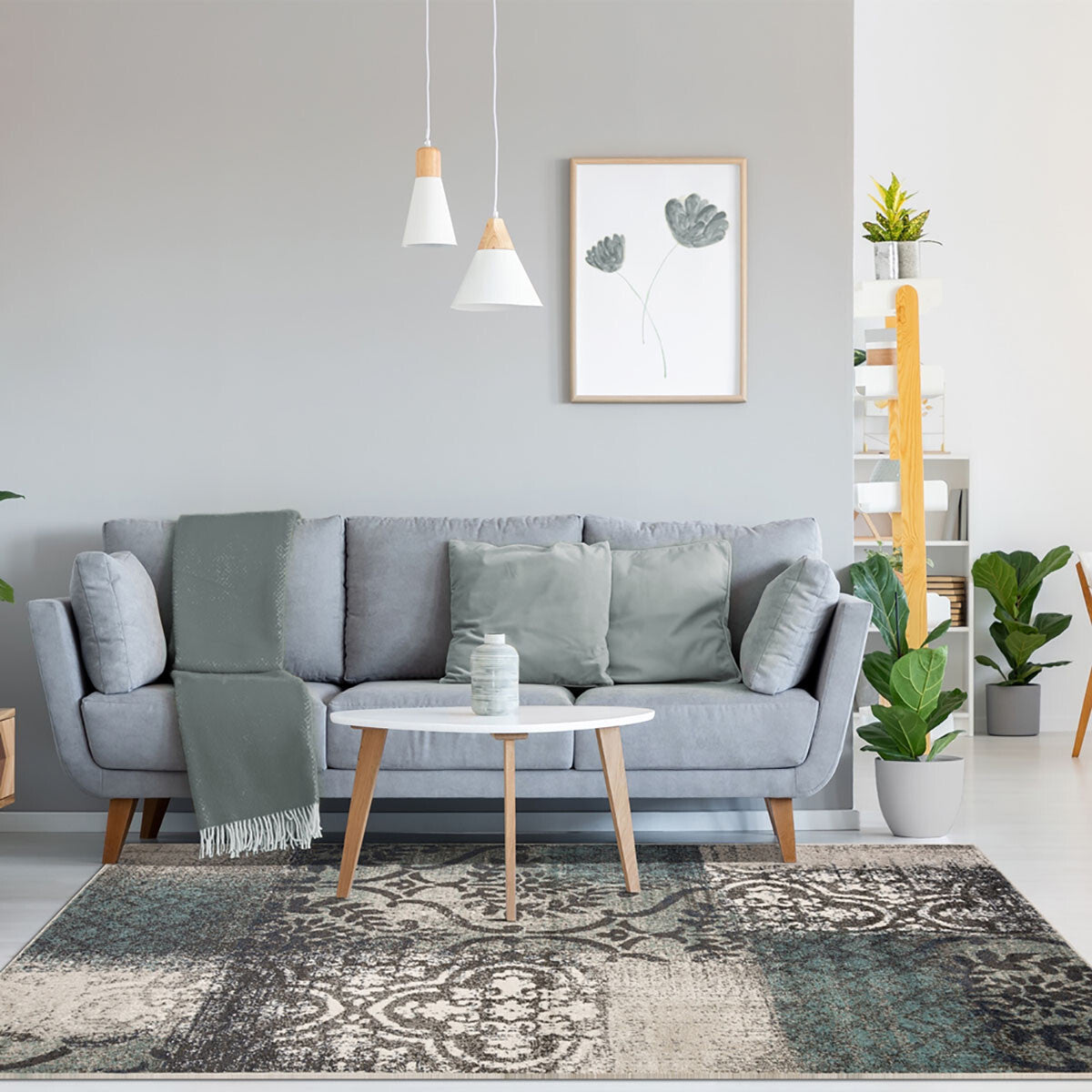 Set an inviting tone in your space with this 7' x 9' teal and gray damask distressed stain resistant area rug. This rectangle shaped rug features a damask design in teal and gray to give it visual interest. A classic shape marries with good looking design for your space Ideal for spaces with kids and pets, this rug is stain resistant to help repel stains and spilled liquids. Place this area rug against a hardwood or tile floor and it will enliven your living space with style and sophistication. 0.31" H x 84" W x 108" D