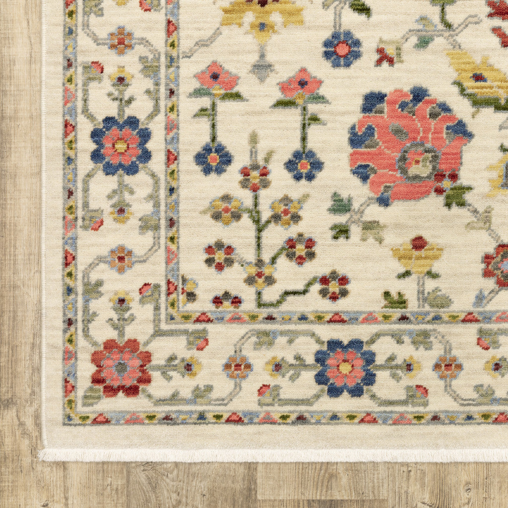 2' X 6' Ivory Salmon Pink Gold Blues Grey Rust And Green Oriental Power Loom Stain Resistant Runner Rug With Fringe