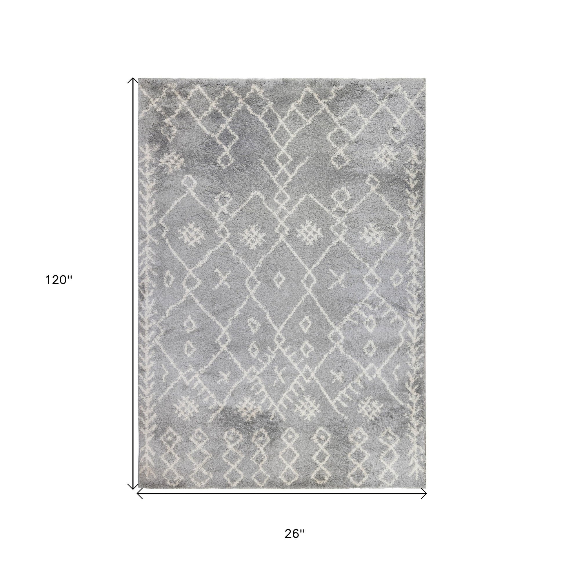 This 10-foot gray and ivory geometric shag runner rug, is a great way to add warmth to a room. This runner shaped rug features a geometric design in gray and ivory to give it visual interest. A classic shape marries with good looking design for your space ideal for spaces with kids and pets, this rug is stain resistant to help repel stains and spilled liquids. The retro shag construction of this luxurious rug will provide a soft and comfortable barrier to color tile and hardwood floors. Area rugs help to give warmth and sense of home to your space. 26-inch H x 120-inch W x 1.8-inch D