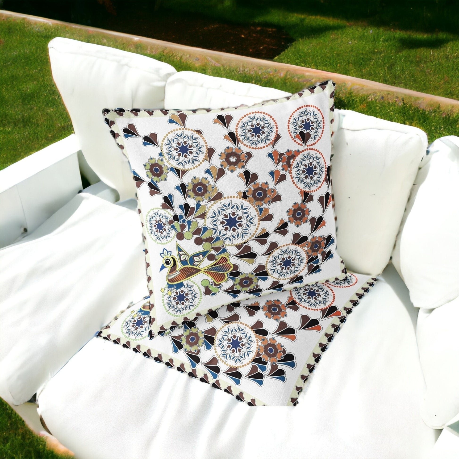 Set of Two 16" X 16" Blue and Off White Peacock Blown Seam Floral Indoor Outdoor Throw Pillow
